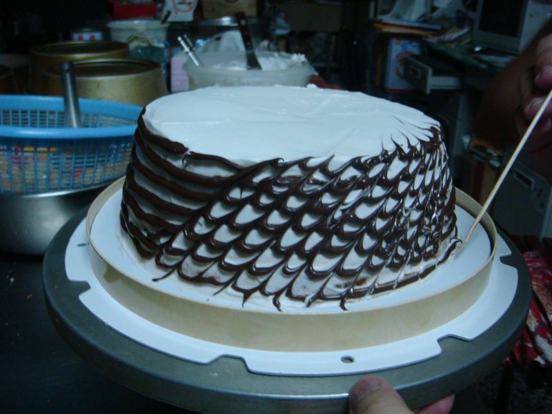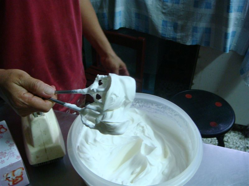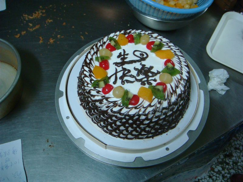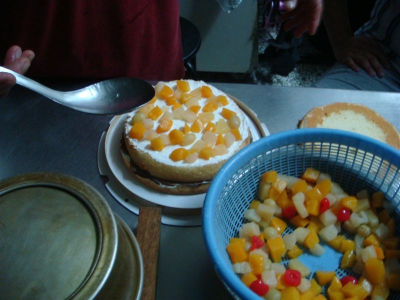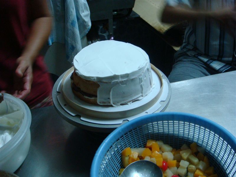 根據吳大姊的製作蛋糕的程序,約略的簡單說了一下,如果要做兩層夾料的的蛋糕,就給將烘焙好的蛋糕橫切成三大片,然後從最底層加料,然後再往上疊上中間那片蛋糕,然後再加最上一層的餡料,餡料的種類可以是新鮮的水果或是綠豆沙之類的,加入餡料的程序完畢之後,接下來就是用剛打好的新鮮奶油,將蛋糕外修飾漂亮一點,奶牛塗好了之後,就是用些特殊顏色的醬料,替白白的蛋糕,加上一點點綴,蛋糕旁邊裝飾完成,最重要的就是蛋糕的上面也就是正上方,可以題字,可以用水果來做些圖案,完成了這些步驟一個新鮮可口又漂亮的蛋糕完成了,吳大姊示範的蛋糕真是漂亮,雖然看吳大姊熟練的做出這麼好吃的蛋糕,但我們中途試做了一下真的不是那麼簡單,果然台上三分鐘,台下十年功。