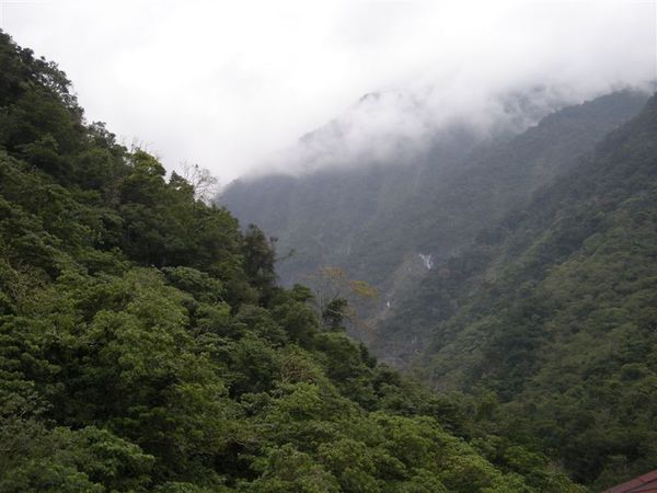從大清水服務區另一頭看去的雲霧繚繞著群山