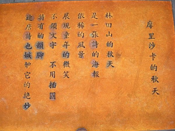 來到了一堆木屋的地板,看到一片生鏽的鐵片,刻著如圖的詩句,摩里沙卡我去查了一下,是日文發音,也就是森林的意思,不知道是哪位詩人,寫了這首摩里沙卡的秋千,彷彿從詩句中就能看到林田山秋天時,一張張動人的畫面。