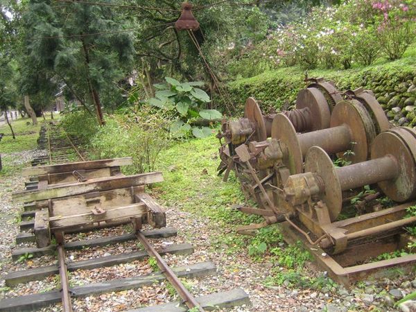 在鐵軌看到了一個很像台車的四輪鐵軌車,仔細看看,車上並沒有像台車驅使前進的桿子,旁邊有三個拉著鋼索的控制器,我想大概就是靠著這個控制器,將鋼索繫於車上,並靠著拉鋼索的力量來驅動車子。