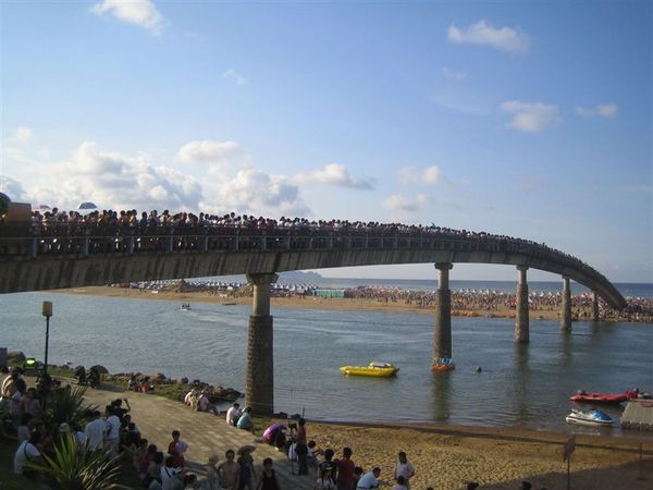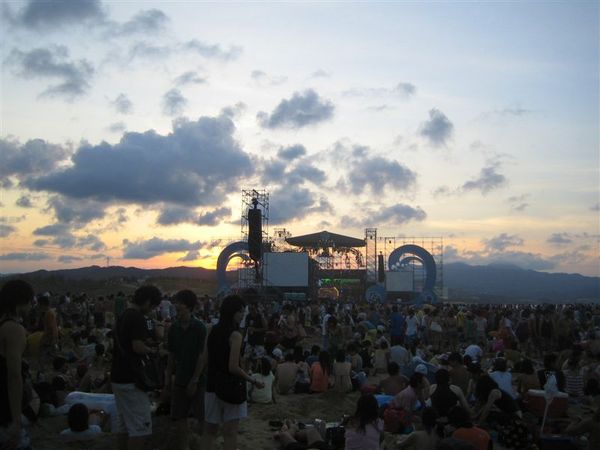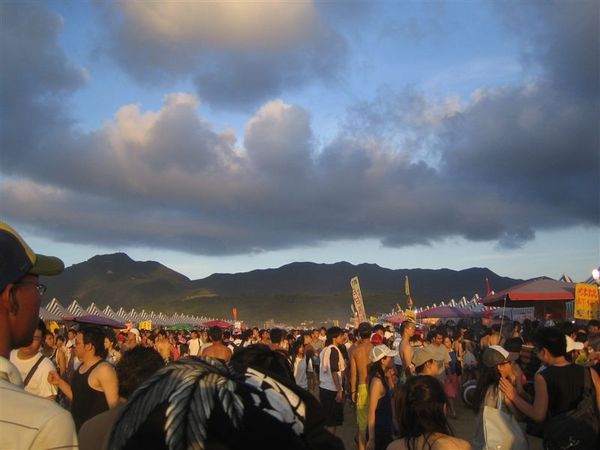 在橋上走了大概約半個多小時,下了橋又是一群人@@,還有左右兩大護法的攤販,本想過去後可以去玩水的說,可是主辦單位怕有危險,所以沿岸都拉起了封鎖線,並有安全人員守著,今天來的還真不是時候,沙灘上不少人打著沙灘排球,也有人玩起沙雕,蓋城堡,不然就是來個沙子浴,往山的那一頭則是,音樂祭大型舞台,我們便向那前進,順便去買今晚的晚餐-烤魷魚、肉羹湯之類的。
