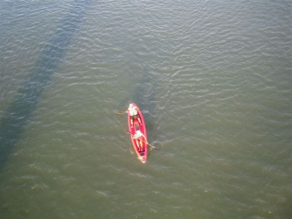 等了好一陣子,我朋友的朋友終於都到了,還真是久阿,終於要踏上彩虹橋,前往有著金色沙子的內灘,也就是音樂祭,我們在橋上走走停停,沿途往橋下看到了岸邊的臨時碼頭,停靠著幾艘救生艇與海上摩托車,隨時準備狀況的發生,辛苦這些人員了。另外也看到了,有人在這內河划獨木舟,之前有看到電視報導有關福隆划獨木舟消息,還蠻想來的,不過今天划船的人似乎特別少。