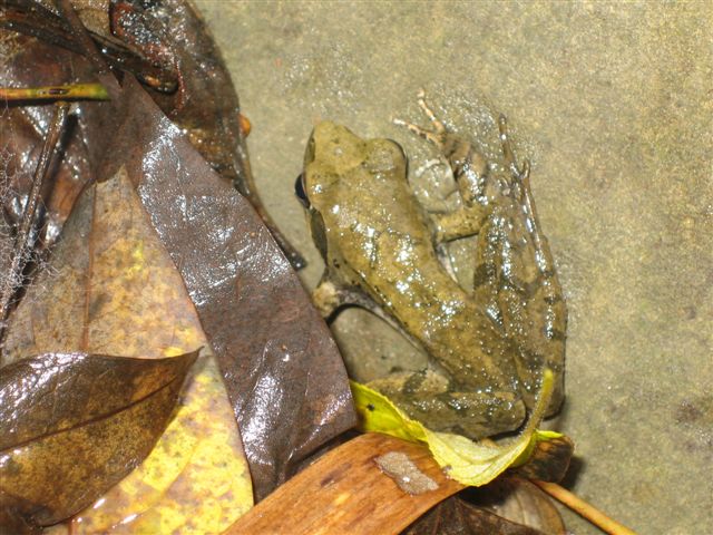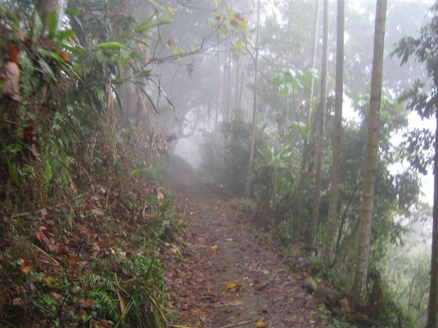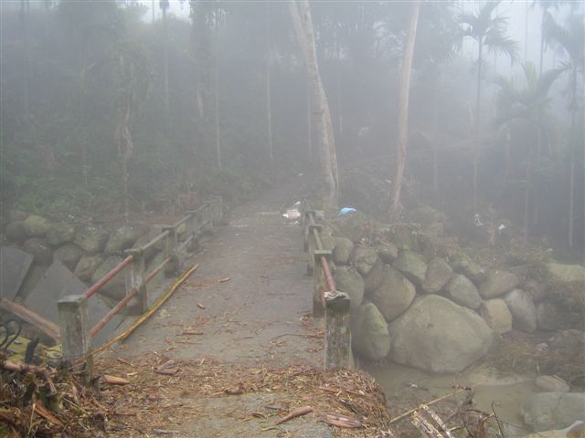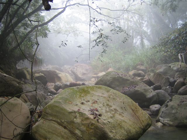 大夥討論了一下,阿貿決定先溯溪而下去探個究竟,希望這條溪流的生態不要被破壞就好,而我跟二哥則現在竹林等待阿貿好消息,果然沒過多久,聽到阿貿在呼喊我們,他發現了溪蝦,於是我跟二哥揹著裝備,從橋下溯溪而下,沿途還是霧茫茫的一片,還看到了青蛙,他們卻跟我說是蟾蜍~呵呵,看到蟾蜍也放心一半了,因為下游應該沒有被破壞的很嚴重,現在就繼續往下走~