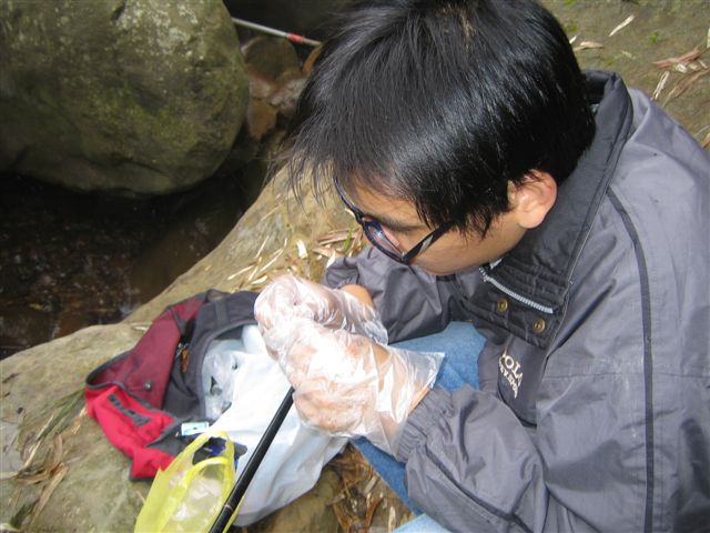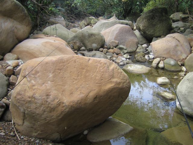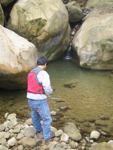 這個釣點我待了一陣子,而他們兩個則繼續往下游溯,尋找另一個釣點,而我呢,在這個釣點,上鉤了三四次,結果拉上來因為竿子太長,釣線也長,要收線時魚就跳掉了@@~果然還是需要練習練習,還有最後一次上鉤,魚也被我拿在手上了,正在拔除他嘴上的鉤,看到他流血不忍心,就把他放旁邊有水的地方,讓牠喝一下水,沒想到牠假裝掛了,沉了下去,而我正要伸手抓回來的時候,牠又突然復活,以極快的速度往石縫鑽了去= =又被跑走一條,正想要往下游去找阿貿,就聽到他的聲音在呼喚我,裝備拿一拿,前往下游與阿貿會合。