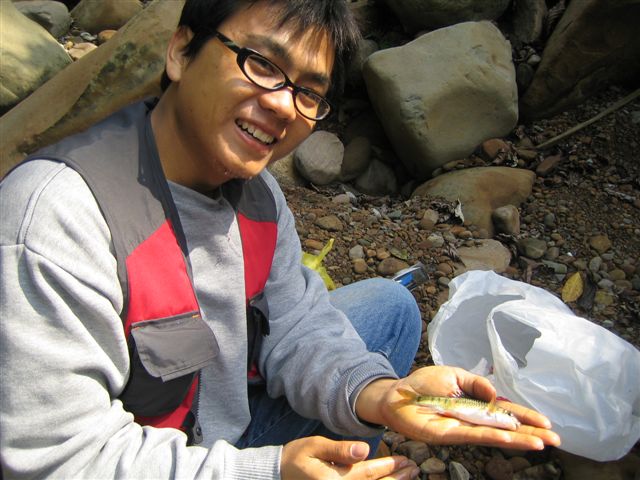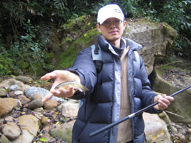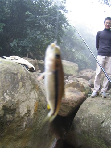 幸好有穿溯溪鞋,行走方便多了,走了好久才到了第二個釣點,一到阿貿叫我小聲點,原來是不能太大聲把魚嚇跑,也不能站太高,要躲至魚看不到人的地方,今天又學了兩招,,一往小深潭看去,超多魚的,而且很大支,拿了竿子,下竿等待今天的目標魚種『石濱魚』,這個釣點的魚群很聰明,看來需要花些時間跟耐心,等待願者上鉤囉,過了10幾分鐘,仔細看浮漂被拖了下去,馬上拉竿上來,哈哈~沒錯就是今天的目標魚種-石濱魚,實在是太開心了,今天總算開張了,而且是大約15公分的唷,將魚取下放至魚籠,我繼續下第二竿,這次又等了比較久,也是10幾分鐘,魚竿又有動靜了,聽到阿貿叫我拉,一拉馬上又是一條約15公分的石濱魚,呵呵,今天運氣超好,阿貿一直在旁邊唸說縣是他綁的,餌是他弄得,功勞應該歸他才對~好啦,借你拿在手上展示一下^^