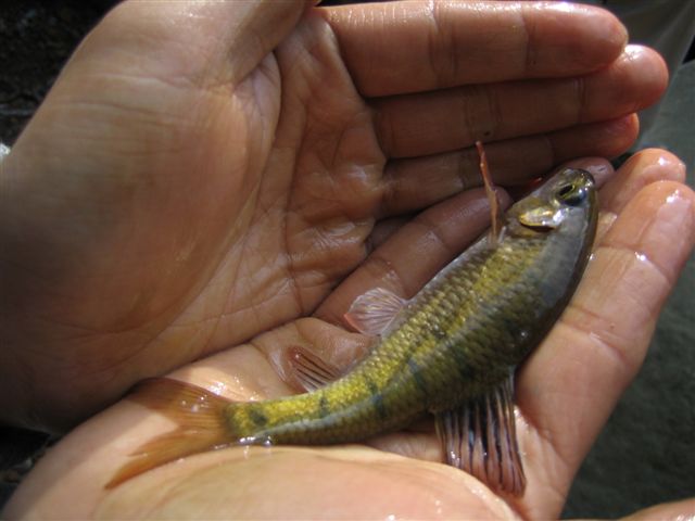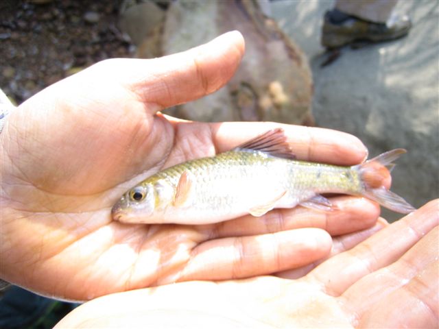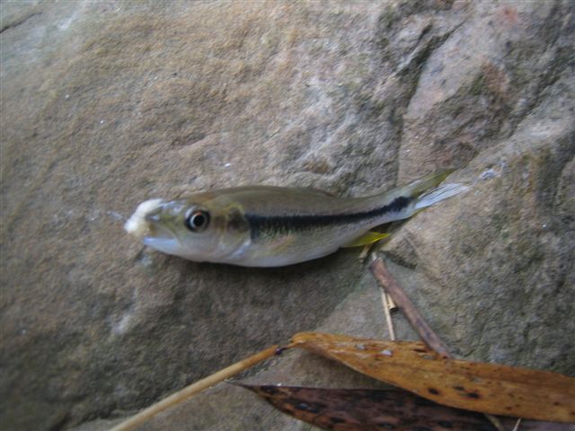 來到了阿貿找尋的第一個釣點,有一個小潭,他正在認真的準備綁線與綁餌,第一竿要來試試手氣,下竿後不到一分鐘就,看不出來是什麼魚,果然還是阿貿利害,說是『山連仔』,以前好像有聽過,不過真的不知道長得如何,去網路查了一下『山漣仔』才是對的字,也有其他俗名:一枝花、山漣仔、午仔魚,其特徵就是鰓蓋後方至尾鰭有一條黑色橫帶的是 山鰱魚 (馬口魚 一枝花 ),長度一般是 8~12公分18公分以上少見,聽阿貿說這種魚很貪吃,難怪一下竿就有收穫