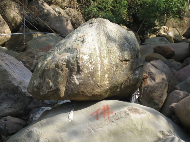 走著走著,從遠處看到一顆非常奇特的石頭,但又看不出什麼,再走進一看,原來是一顆帶著人臉的石頭,我又絕得像電玩中的『史萊姆』的怪物,有沒有看到阿,下方就有一個佛字,看來快找到武功秘訣了,在往上走一點,我們攀岩石頭而上,爬到了人家的橘子園,於是順著園區小路,接到了大馬路,結束今天的溪釣之旅,如果繼續溯溪而上回到當初的原點,可能還要走一個小時,今天的溯溪之行,也確定了這條溪流的生態還是很豐富,真是高興,希望颱風不要再來了,上游也不要在有人為的破壞了。大家肚子也餓了,回到車上洗腳、換裝,準備出發前往下一個目的地~水里、信義~衝阿我們的午餐『可口涼麵』~(未完待續)